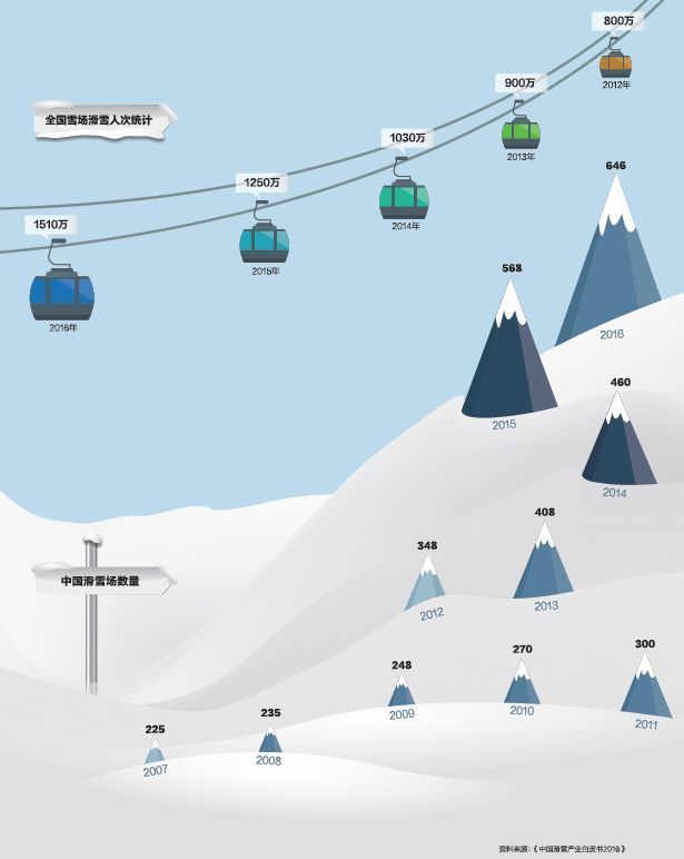 曙光来得却比预料得早。据《中国滑雪产业白皮书》,2015年,全国共有568家滑雪场,较2014年新增108家,增长了23.48%;而在2010年,全国只有270家。到了2016年,全国滑雪场数量达到646家,比上一年增加了78家,增幅13.73%。滑雪人数从2015年的1250万人次增长到1510万人次,增幅20.8%。